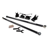 Fabricated from 2-inch OD x 3/16-inch wall steel tubing with a threaded bung welded in toward the axle and a CNC-machined end at the frame. Axle mount uses BDS's ultra-durable large-forged flex end and jam nut. Using a forged housing with large 1-1/4-nch x 12 threaded shank, a single sided snap ring and 1-piece flex ball, the flex ends are capable of up to 15 degrees of misalignment in either direction. At the frame end the bar uses a durometer specific polyurethane bushing and free floats in the traction bar utilizing a pair of dual stage internal compression springs and UHMW polyurethane bearings.