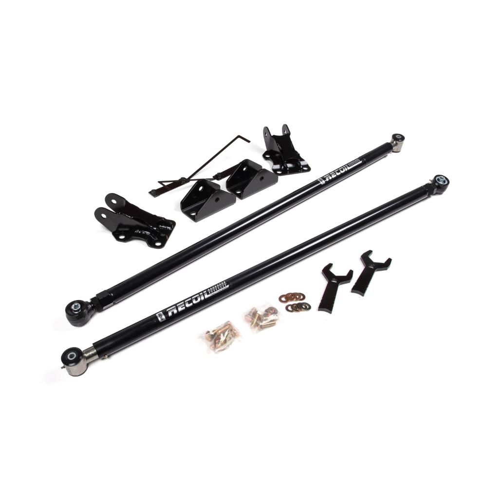 Improve traction on your 2021-2024 Ford F150 4WD without limiting wheel travel with a BDS Recoil Traction Bar Mounting Kit, made with heavy wall construction and internal compression springs that can be loaded or unloaded while installed on the vehicle to control axle wrap. Full float design for bind-free performance and can be installed with a range of lift heights.