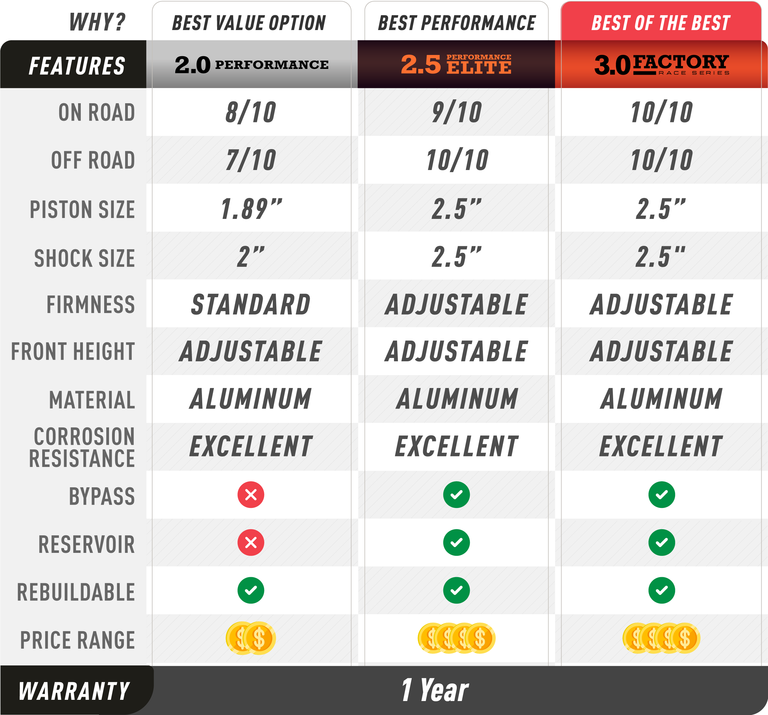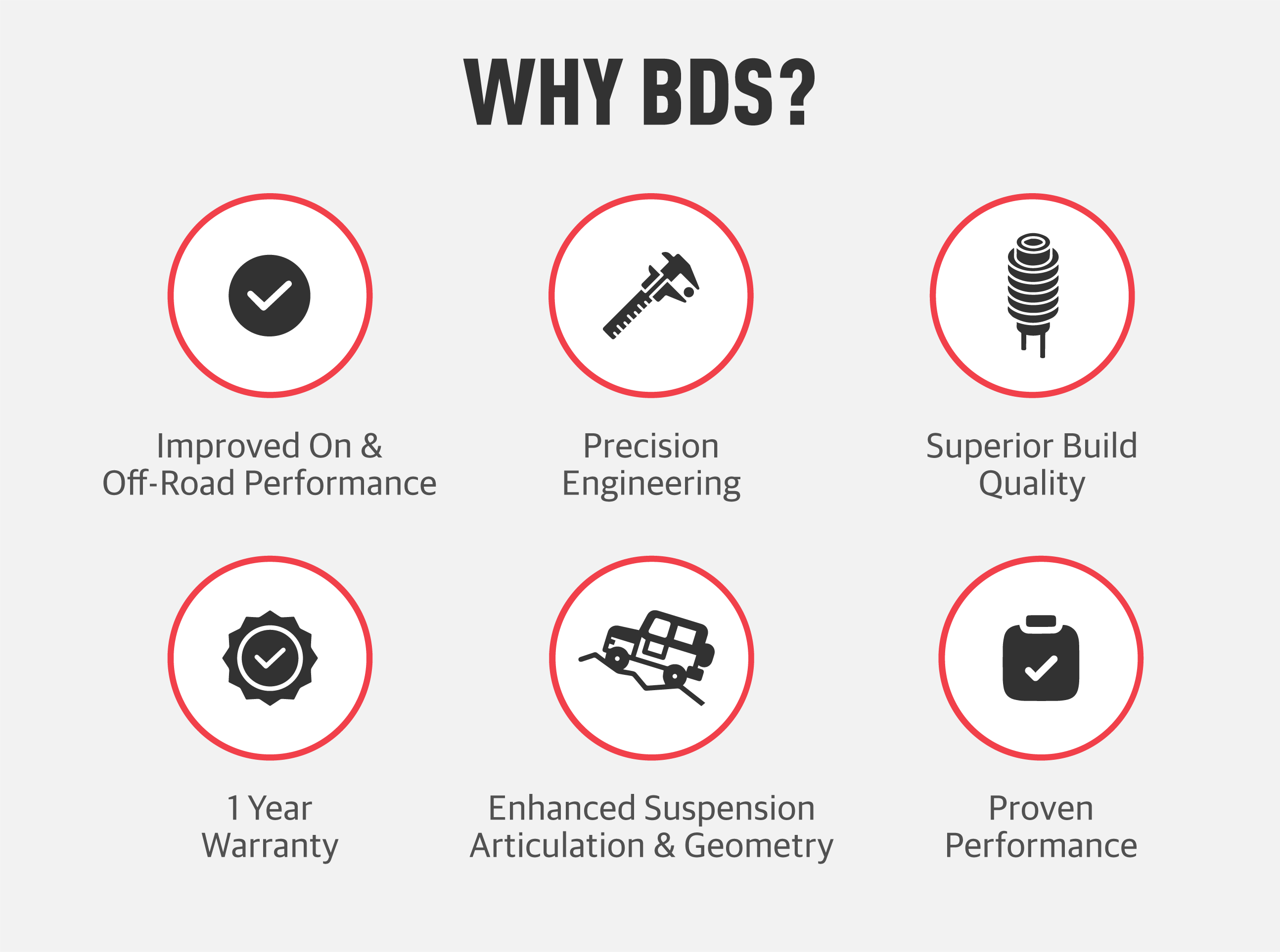 To help you make your decision, you can see how much a BDS lift kit costs, visualize your ride with lift heights ranging from 2 to 6 inches, and understand the implications of different load setups. We have also provided a comparison table that highlights the differences between BDS's different shock options—2.0 Performance, 2.5 Performance Elite and 3.0 Factory Race.