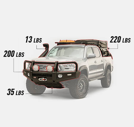 - Heavy: Front (150-250 lbs) i.e. Bumper + Winch + Skid Plate | Rear (400-800 lbs) i.e. Bumper + Roof Tent + Freezers + Drawers + Rear Spare Tire.