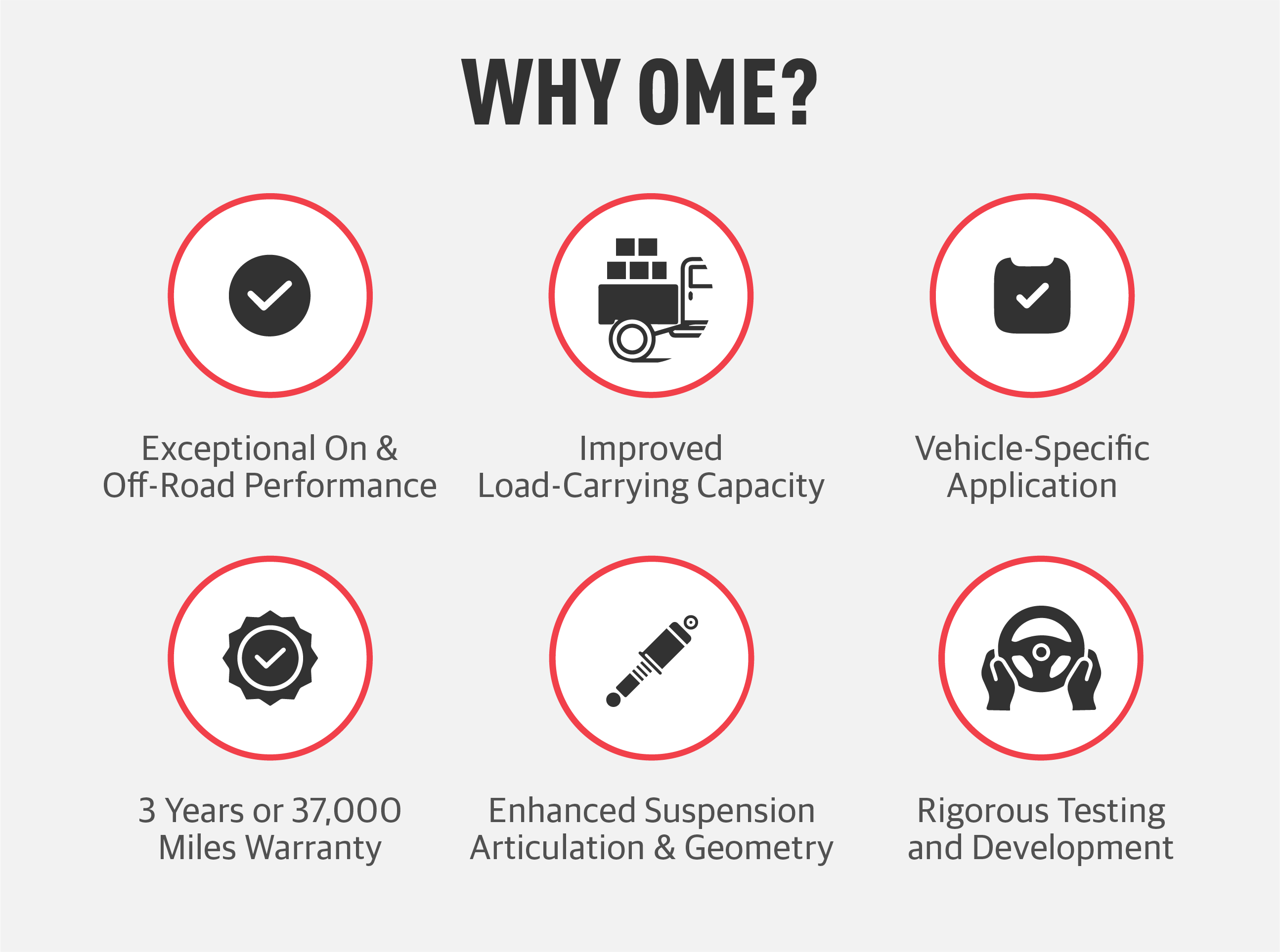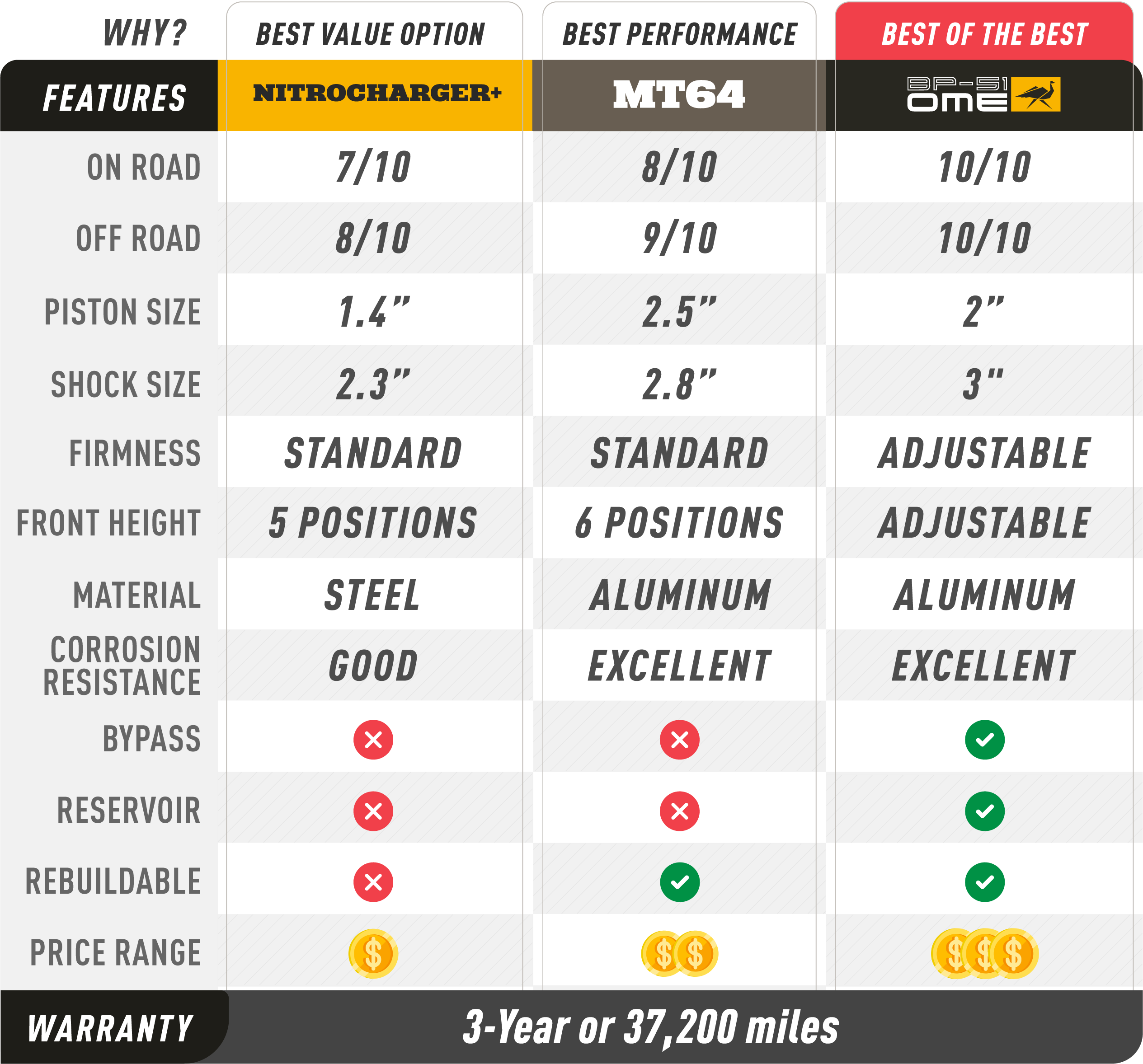 To help you make your decision, you can see how much an OME lift kit costs, visualize your ride with lift heights ranging from 2 to 3 inches, and understand the implications of different load setups. We have also provided a comparison table that highlights the differences between OME's different shock options—Nitrocharger Plus, MT64, and BP-51.